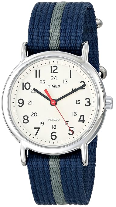 - Round silver-tone watch with 24-hour time on inner dial and woven nylon band with contrast stripe